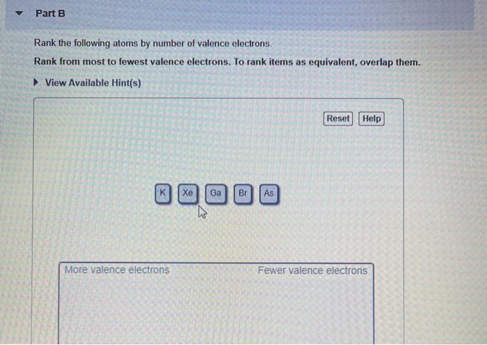 Solved Part B Rank The Following Atoms By Number Of Valence Electrons Rank From Most To Fewest Valence Electrons To Rank Items As Equivalent Overlap Them View Available Hint S Reset Help More Valence