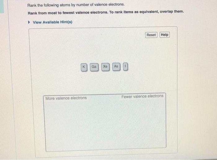 Solved Part B Rank The Following Atoms By Number Of Valence Electrons Rank From Most To Fewest Valence Electrons To Rank Items As Equivalent Overlap Them View Available Hint S Reset Help Rb Ga